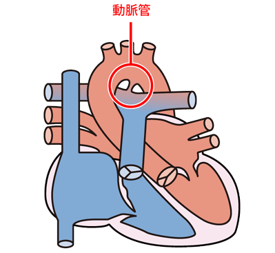 動脈管は赤ちゃんがお母さんの体の中にいるときには必要な構造ですが、通常は生後48時間以内に動脈管は縮んでほとんど血液が流れなくなります。そして、数週間もすると完全に閉じてしまいます。自然閉鎖せずに肺動脈と大動脈がつながったままの状態になると、大動脈から動脈管を通って肺動脈の方に血液が流れ込むようになるため、肺動脈の血液量、また左心房・左心室に戻ってくる血液量が増加して、心臓に負担が生じます。太い動脈管だと、子供のうちに症状が出てきます。太くない場合は、気がつかれずに大人になりますが、長期間にわたって心臓に負担がかかるので、息切れ、動悸、心不全を生じることがあります。また、心内膜炎(細菌が動脈管周囲に感染すること)の危険性があります。