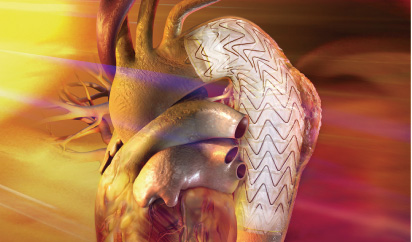 ステントグラフトによる治療は、腹部では大きく切開することなく、また、胸部では、肋骨を切らずに、体外循環(人工心肺)を使用しないで治療できますので、患者さんにとっては体に優しい治療法と言えます。所要時間も短いので、身体にかかる負担が少ないのが特徴です。ステントグラフトは,人工血管にステントといわれるバネ状の金属を取り付けた新型の人工血管で、これを圧縮して細いカテーテルの中に収納して使用します。脚の付け根を4〜5cm切開して動脈内にカテーテルを挿入し、動脈瘤のある部位まで運んだところで収納したステントグラフトを放出します。胸部や腹部を切開する必要はありません。放出されたステントグラフトは、金属バネの力と血圧により広がって血管内壁に張り付けられるので、外科手術のように直接縫いつけなくても自然に固定されます。大動脈瘤は切除されず残りますが、瘤はステントグラフトにより蓋をされることで血流が無くなり、次第に小さくなる傾向がみられます。また、たとえ瘤が縮小しなくても、拡大を防止することで破裂の危険性がなくなります。