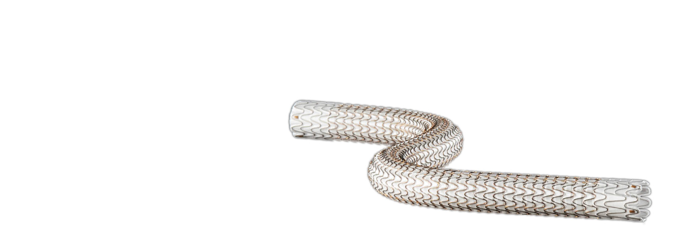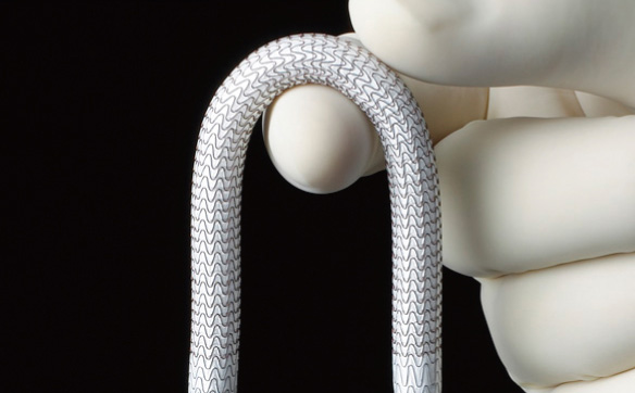 この治療は、下肢などにおける末梢血管疾患に対する血管内治療に使用されるステントグラフトです。平成28年2月、本邦で初めて浅大腿動脈における末梢動脈疾患治療の適応を有するステントグラフトが薬事承認を受け、これまで外科的バイパス術が中心に行われてきた長区域の狭窄・閉塞病変において、新たな血管内治療を可能にするデバイスとして注目されています。大きな切開を伴う外科的人工血管置換術に比べ、患者さんの負担を低減することができます。末梢血管ステントグラフトは世界では既に幅広く使用されており、日本でも末梢血管疾患治療における長期予後の改善が期待されています。
