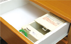 盗難予防のため、多額の現金や貴重品はお持ちにならないでください。床頭台の引き出しにセーフティボックス(金庫)を設置しております。鍵は放置せずご自分で管理し、退院時には金庫の鍵収納スペースにお返しください。なお、鍵の紛失、破損の場合は324円を徴収させていただきます。病院内での紛失、盗難につきましては責任を負いかねますので、充分にお気をつけください。