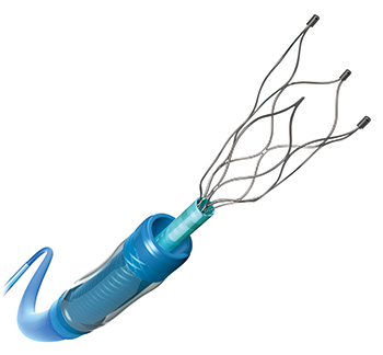 血管内治療は、rt-PAが無効もしくは適応外の患者さんに活用できることから、死亡リスクの高い脳梗塞患者を救える治療法として期待されています。カテーテルという細い管を足の血管から挿入して、頭の中の脳血管へ進め、血管を塞いでいる血栓を網目状のデバイスに絡めつつ回収し、閉塞した脳血管を再開通させます。 この治療は血管を傷つけてしまうリスクが常に伴い、特別な技術が必要となります。その技術を担保するのが「脳神経血管内治療専門医」です。当院には6名の脳神経血管内治療専門医が在籍し、脳神経血管内治療研修施設となっています。