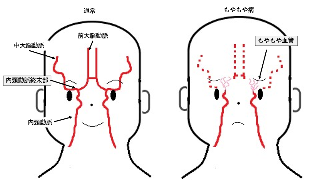 もやもや病とは脳の血管が通常の血管と異なり、文字通り「もやもや」とした血管に見えることから名づけられた病気です。内頚動脈という脳に栄養を送る太い血管の突き当り部分が細くなり、脳の血流が足りなくなることで症状が出現します。この血流不足を補うために太い血管から枝分かれした細い血管が拡張・新生することで通常みられないもやもや血管が出現します。この血管は脆く部位によっては出血しやすいことがわかっています。