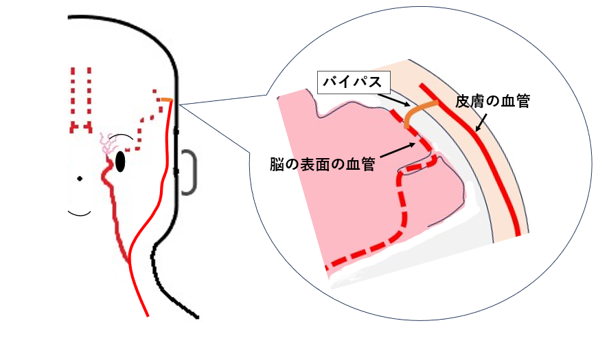 内科的治療には限界があるため手術が必要となる場合があります。血流不足の場合は足りない血液を他の血管から補う手術を行います。多くは皮膚の血管を脳の血管とつなぎバイパスと呼ばれる別の血液が流れるルートを作ることで血流不足を改善させます。出血した場合についても、出血が落ち着いたあとに同様のバイパス手術を行います。手術により血流不足を補うことで異常に発達した弱いもやもや血管への負担を減らす効果があります。