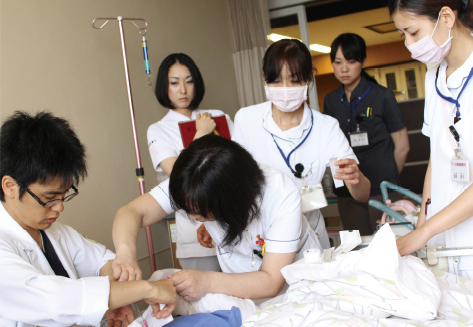 「褥瘡」とは一般的に「床ずれ」といわれ、体重が集中する骨と寝具に挟まれた皮膚組織が圧迫され皮膚やその下にある組織が死んでしまうことをいいます。褥瘡ケアチームは褥瘡を保有している患者さんに対し週1回褥瘡回診を行っています。患者さんのベットサイドでケアを行い創処置方法の評価・見直し、薬剤師や管理栄養士による栄養介入など他職種と連携しながら各職種の専門性を生かした多面的な褥瘡治癒にむけてケアを提供しています。褥瘡保有したまま退院・転院する患者さんに対しては、必要に応じ情報提供書類を作成し、褥瘡ケアの継続ができるように努めています。