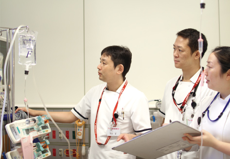 当院は、救急医療及び高度医療に力を入れ、地域の急性期病院の役割を担っています。そのため、多くの重症の方が入院され高度医療を受けられています。私たちクリティカルケア認定看護師は、高度医療が安全に実施されるように集中治療領域での質の高い看護を提供し、回復に向けての援助を行っています。また最近では、高齢化を背景に複数の疾患を抱えておられる方も多く、集中治療室だけでなく一般病棟においても重症な方、若しくは重症になると予想される方が入院されることも多くなってきました。そこで、集中治療領域だけでなく一般病棟にも週に1回定期的に訪問させていただいておいております。一般病棟においても質の高い看護を受けることが出来るように、重症患者さんの観察や病棟看護師への指導や相談を行いながら、さらなる重症化の回避に努めております。