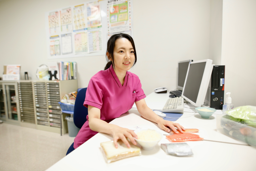 栄養管理課では食を通して患者さんがよりよい状態で治療に臨まれ、回復されるよう栄養のサポートを行っています。栄養士・調理師は入院中のお食事の調理を担当しています。安全でよりおいしいく、体の栄養だけではなく心の栄養となる食事の提供を目指し、日々調理方法や味付け、盛り付けの工夫・改善に努めています。管理栄養士は患者さんの個々の身体状況や食事の様子を伺いながら、過不足がないよう、ひとりひとりの年齢や体格にあわせた栄養量、栄養補給方法、食事形態の提案を行っています。どうしても食べられない場合には補助食品を使用しながら、出来るだけ、栄養バランス、栄養状態が良くなりますよう栄養管理を行っています。また、栄養指導は患者さんの病態やライフスタイルにあわせ、ご自宅でも無理なく食事療法が続けられるよう、内容や方法などの情報提供を行っています。