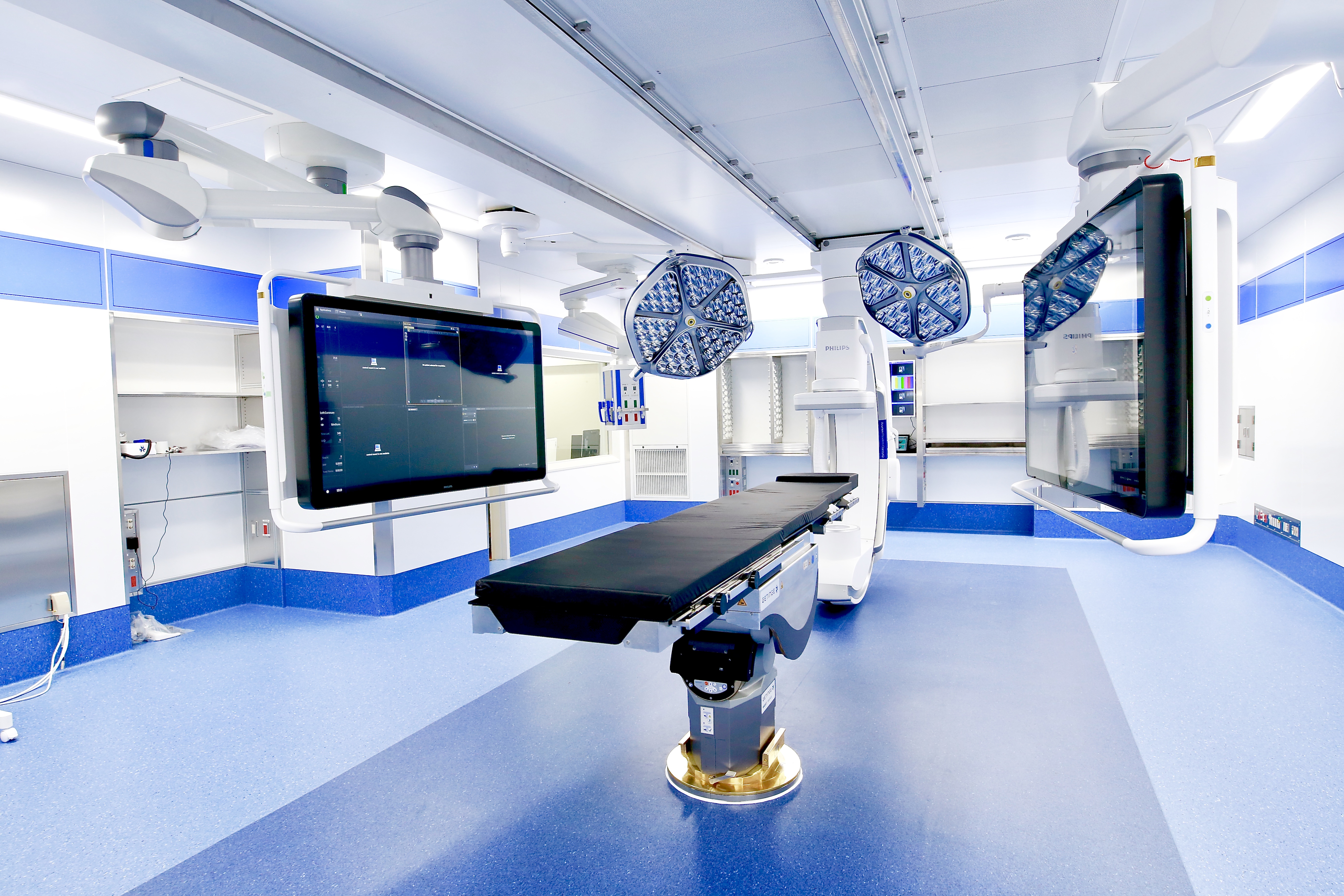 胸のCT検査が簡単にできるようになり,肺がんも早期に発見できるようになりました。一方で直径10mm前後の”影“が見つかることも増えてきました。このような影も,肺がんが疑われる場合には診断と治療を兼ねて手術が必要になることがあります。しかし、CT検査で淡い小さな影だけが写し出されているがんは、胸腔鏡では見えず手を入れて触ってもわからないことがあります。そのような症例では、手術中にCT撮影のできる手術室「ハイブリッド手術室」にて手術を行います。ハイブリッド手術室のCTで肺がんの位置を確認しながら手術を進める「ハイブリッド手術」は、小さな肺がんも手術中にCTという”眼“を使って見逃さず正確に切除できます。