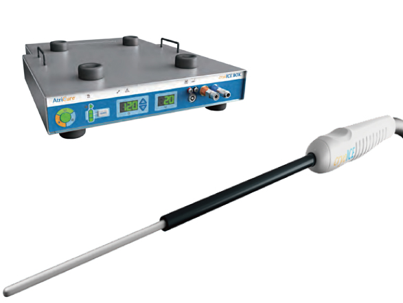 この手術は、心房細動を引き起こす心房内に生じる異常な電気伝導を遮断するために、心房の中をまるで迷路(英語でメイズ)のように複雑な切開を入れ、、再度縫い合わせるものでした。これにより、異常な電気伝導が断ち切られ、心房細動から規則正しい脈に回復させることが出来るようになりましたが、心筋を一時的に切り、再度縫い合わせるのには時間がかかり、出血のリスクが高いという問題がありました。近年、高周波の電流で心筋の変性壊死を作成させ、心筋を切った場合と同じ効果が得られる高周波デバイスが開発され、時間の短縮と出血リスクの軽減が得られるようになり、安全に手術が行われるようになっています。また当院では、切開する範囲を5-7cmにとどめる低侵襲心臓手術「MICS」でメイズ手術を可能にするために、cryo ICEを導入しました。この医療機器は高周波デバイスではなく、クライオアブレーションと同じように冷凍凝固壊死を心筋に作成する医療機器です。亜酸化窒素ガスを使用し-55℃から-70℃で冷凍凝固を作成します。また冷凍直後も組織からの取り外しが容易となっており、先端形状の調整とプローブ先端が最大10cm延長できるため、個々の患者さんに応じた手術が可能です。