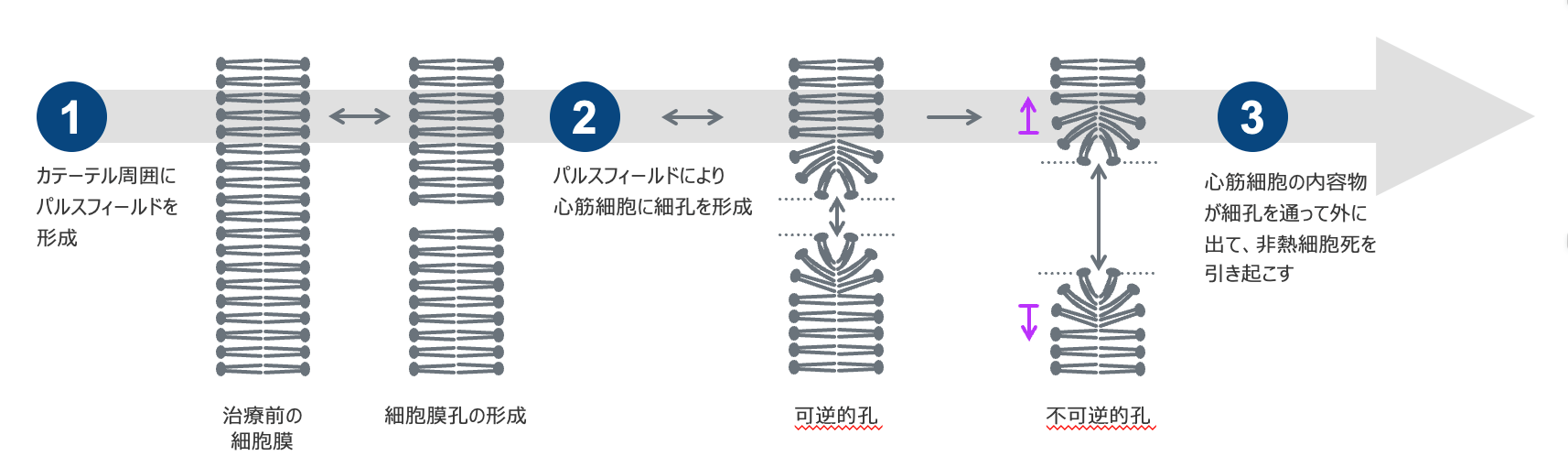 一定強度のパルスフィールドエネルギーを与え、細胞膜に細孔を形成し細胞死を引き起こす。