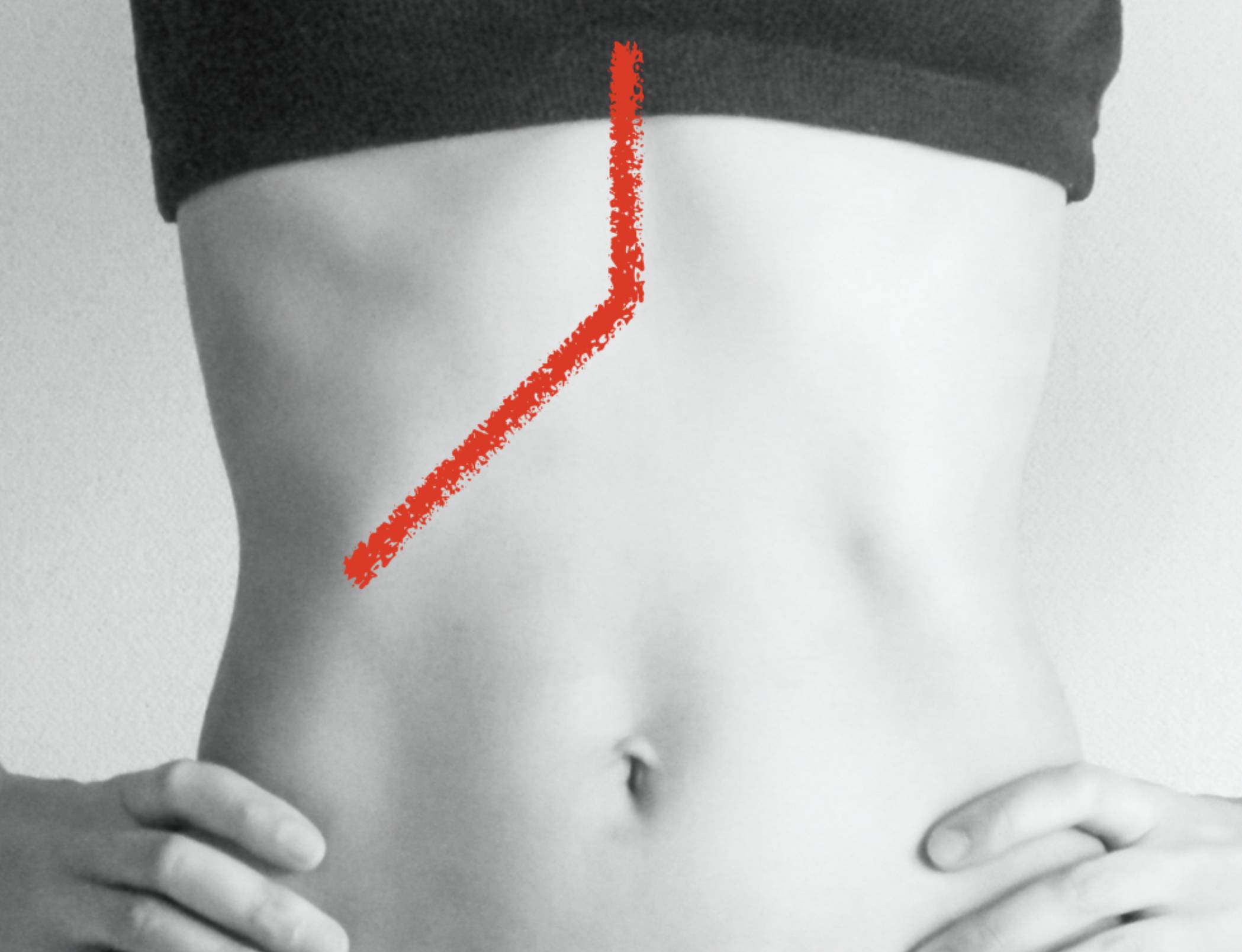 肝臓はおなかの中の最も頭側に位置し、右の肋骨に覆われ、横隔膜に固定された臓器です。安全に手術を行うためには、十分に肝臓が見える状態で操作を行う必要があるため、開腹手術ではどうしても25-40cmくらいの大きな切開が必要であり、時には肋骨の間を切り開く必要があります。