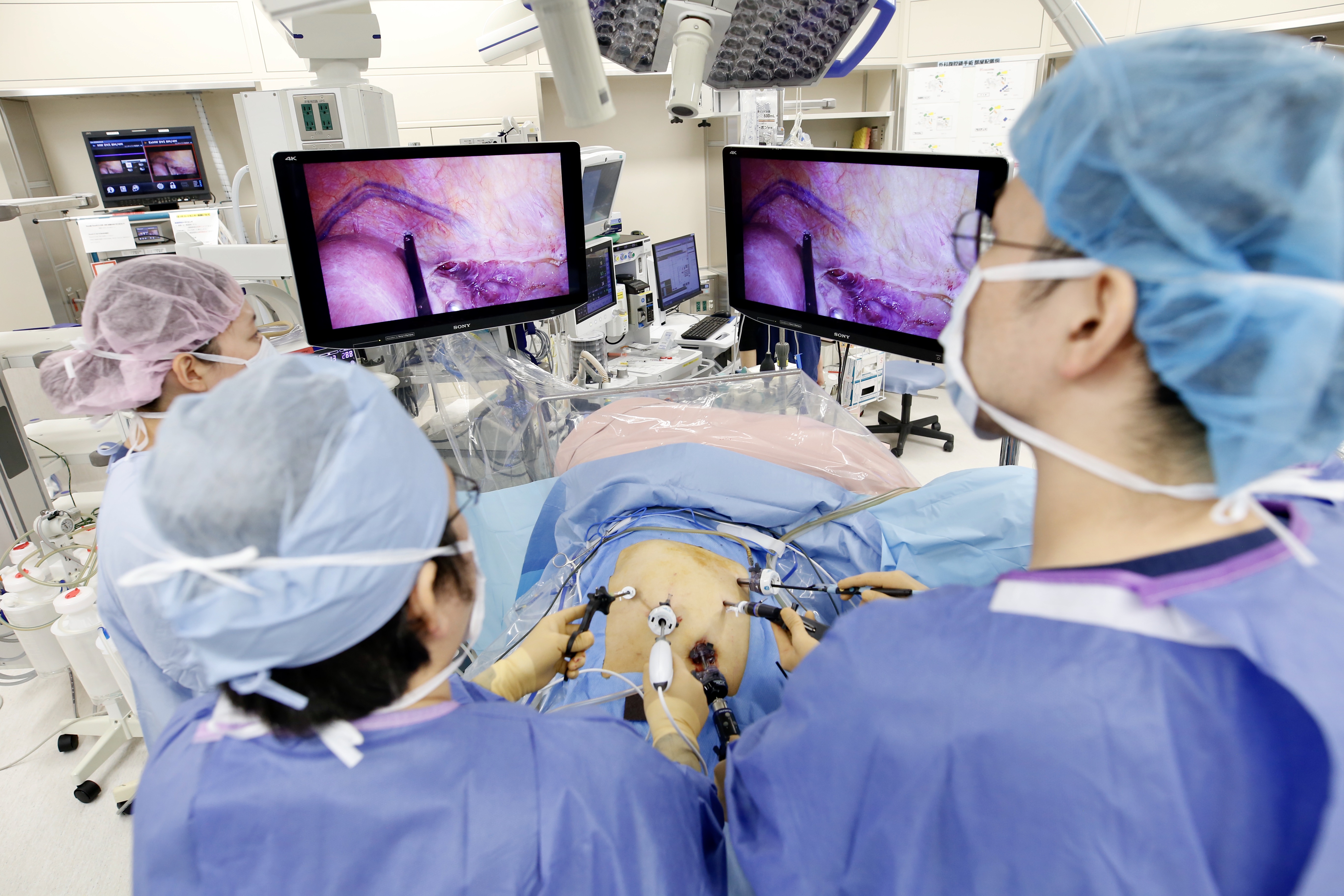 腹腔鏡手術においては数ヶ所の小さな穴から手術を行うため、傷が小さくてすみ、疼痛も軽減されます。その分手術後の回復が早く入院期間も短い(通常4-8日)ため、患者さんの負担が少ない手術といえます。腹腔鏡を利用して近接した映像を見ながら手術を行うことになるので、開腹手術での視野と比べて拡大された視野で観察することができます。それにより、微細な解剖を把握しながら精密な操作が可能となります。また開腹手術ではお腹側から見下ろして手術を行うことになりますが、腹腔鏡では通常の開腹手術では見ることができないような、背側から覗き込むような視野も得ることができます。とくに肝臓の手術においては、お腹を大きく開けても視野が十分に得られない場合もあるので、 腹腔鏡を用いることで本来見えにくいはずの背中側の視野が得られるのは非常に有用です。