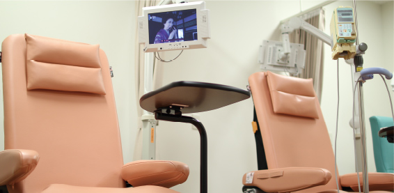 がんの三大治療は手術・放射線治療・化学療法です。抗がん剤による治療が標準的治療・ガイドラインとして確立され、有害事象(副作用)対策が進歩したことによって、外来での化学療法が可能となりました。以前は入院で行っていた化学療法も、入院しなくとも安全に抗がん剤治療が行えるように変化してきています。当院の外来化学療法室では、化学療法や潰瘍性大腸炎などに対する生物学的製剤の投与がより安全で確実に行えるよう管理を行っています。