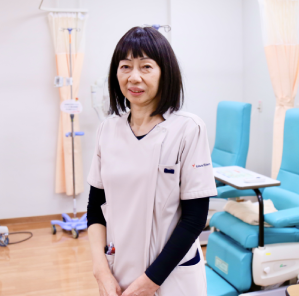外来化学療法室には、がん化学療法看護認定看護師というがん化学療法に関して専門知識と技術を有する看護師がいます。がん化学療法看護認定看護師は、がん化学療法を安全に、苦痛を最小限に過ごすことができるよう、患者さんやご家族と一緒に考え支えていきます。患者さんが自分らしい生活を送りながら、治療を受けることができるよう、患者さんに沿った看護の提供を目指しております。
