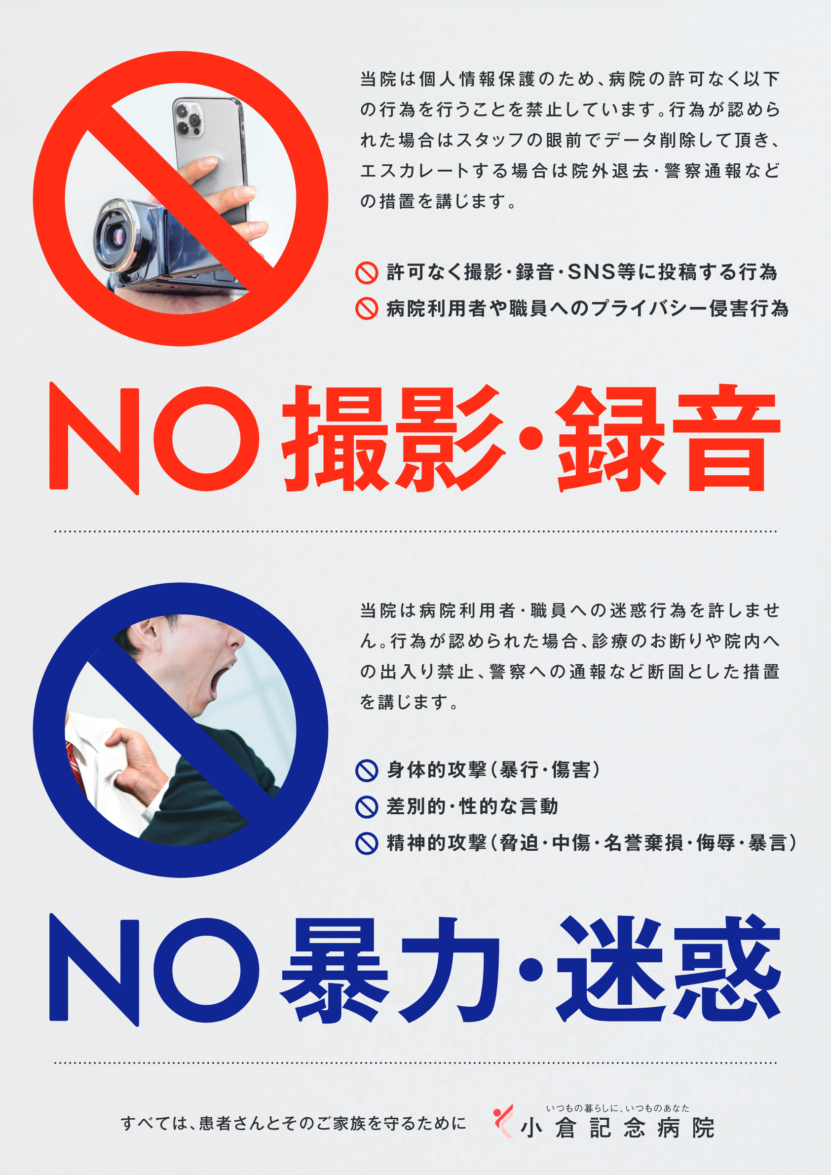 当院は、患者等からのご意見・要望に対しては、これからも真摯に対応してまいりますが、ペイハラに該当する行為に対して、「毅然とした対応」を行い、職員一人ひとりが、心身ともにいきいきと活躍できる「働き甲斐のある職場」にすることで、患者等に、より質の高い医療サービスを提供することが出来るとの思いから「小倉記念病院ペイシェントハラスメントに対する方針」を以下のとおり策定しました。