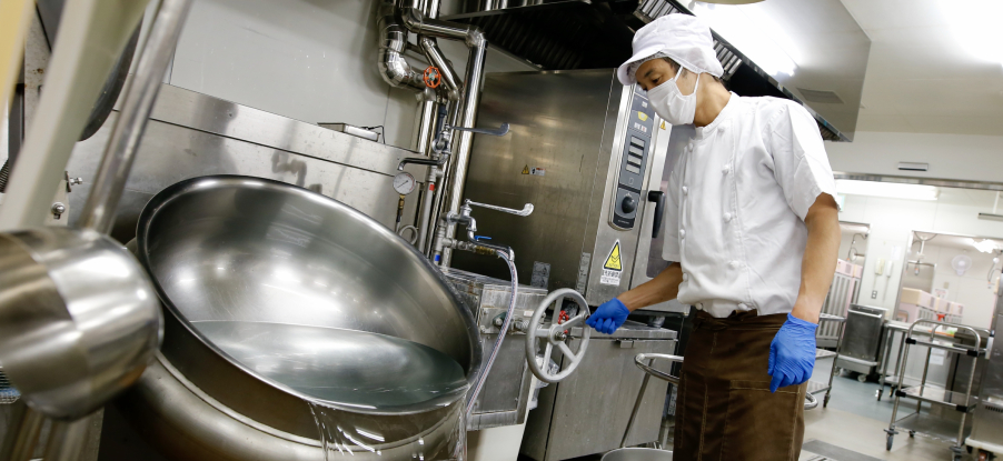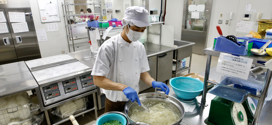 病院は、レストラン、ホテル等の調理の仕事の中でも特殊な職場です。患者様一人一人にあわせた料理を作るために塩分や脂質などを抑えたり、安全安心な料理を提供するために加熱や殺菌を徹底しています。その調理作業の中で、旨いと感じさせる料理を作っていく“おもしろさ”があります。食事はとても大切だと思っています。病院の食事は美味しかった、もう少し味付けを工夫して欲しい等、患者様から頂く言葉がとても励みになります。患者様の回復のサポートが出来る、とてもやりがいのある仕事だと思っています。皆さんと一緒に働けるのを楽しみにしています。