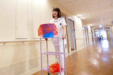 総合病棟8Fは3科の混合病棟になっていて、眼科・整形外科は手術する患者さんが多く、術後管理があります。呼吸器内科の患者さんは胸腔穿刺などの処置も多く、難しいですがとても勉強になることが沢山あります。それぞれの診療科の患者さんの看護は特徴的で学んで覚える事も多く、また忙しいですがとてもやりがいのある病棟です。でも入職してしばらくは何を行うにも先輩の見守りが必要でわからないことばかりでした。1年近く経つと一人で出来ることも増えてきます。そして一人でできる事が増えると逆に新たな疑問も出てきます。そんな繰り返しですが先輩にも頼りながら頑張っています!