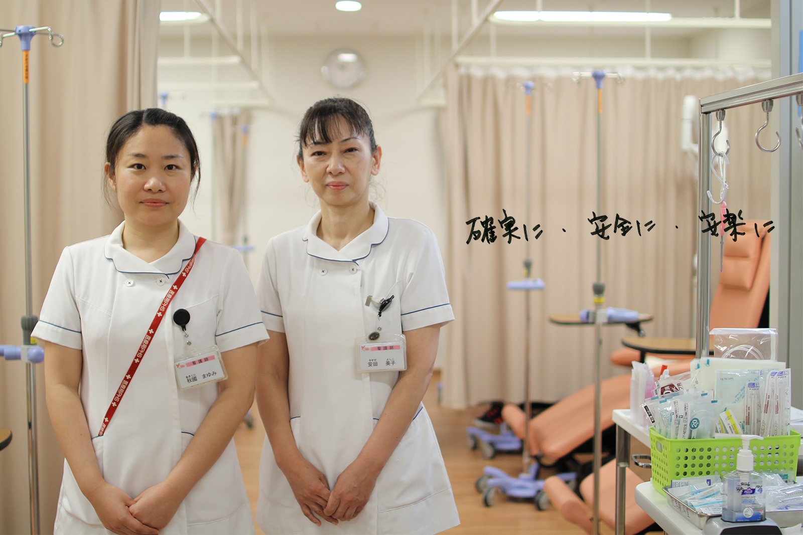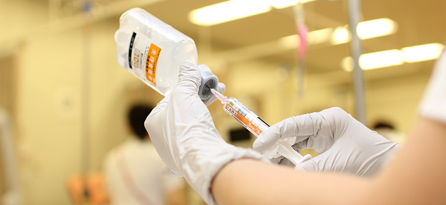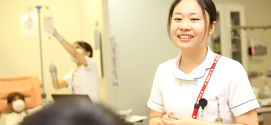 私は、外来化学療法室で専任看護師として勤務しています。看護師経験すべてにおいて、がんの患者さん、ご家族と共に過ごしてきました。特に血液内科の移植看護に携わってきました。その中で、抗がん剤の副作用や合併症と闘いながら治療を受けている患者さん、その苦痛を目の当たりにするご家族に対して、十分なケアができているのか、もっと何かできることがあるのではないだろうか、という思いから、がん化学療法看護認定看護師を目指しました。がん化学療法は、医療情勢や患者さんのQOLを重視した視点などから、通院で実施することも多くなってきています。その中で短時間に、タイミングを逃さず、ニーズに合わせて先取りしたケアができるようにつとめています。