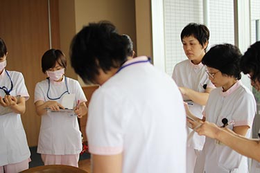 先輩方は患者さんのことに詳しく、入院生活を快適に送れるよう 常に患者さんの声に耳をかたむけては自分達で問題を上げ改善に取り組んでいきます。問題解決の手法であるTQM活動で全国大会に選ばれるほどの自慢の職場です。