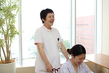 早出は7:00出勤と朝が早く、若い時はきつい時もありました。配膳・配茶から始まり、患者さんの検査やリハビリのための搬送で行ったり来たりと歩き回るので体力が必要な仕事だと思います。新病院になってからは、患者さんの洗髪や清拭、おむつ交換等のケアもできるようになり、患者さんとの距離が一層近づきました。患者さんの傍で元気になっていくのを感じることができ、退院後に外来で「元気になったよ〜」と声をかけられたりすると嬉しくて、私たちも回復へのお手伝いをしていると思うとやりがいを感じます。