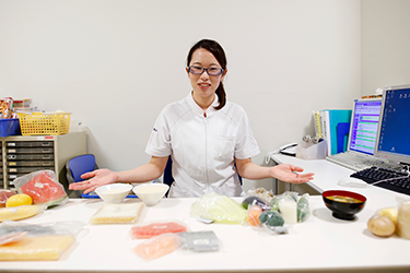 患者さんへの栄養指導も管理栄養士の重要な仕事の1つです。病気によってガイドラインが定められておりそれに沿って栄養指導を行っていきますが、理想としてはこうしてほしいと話しても、実際には患者さん1人1人生活環境や病状が異なっており現実的には実行できないケースも多々あります。そのため、患者さんが“これならできる”“これならやってみようか”と実現可能なアドバイスを行い、患者さん1人1人に「実行できる栄養指導」を行うことができるようになることを目標にしています。
