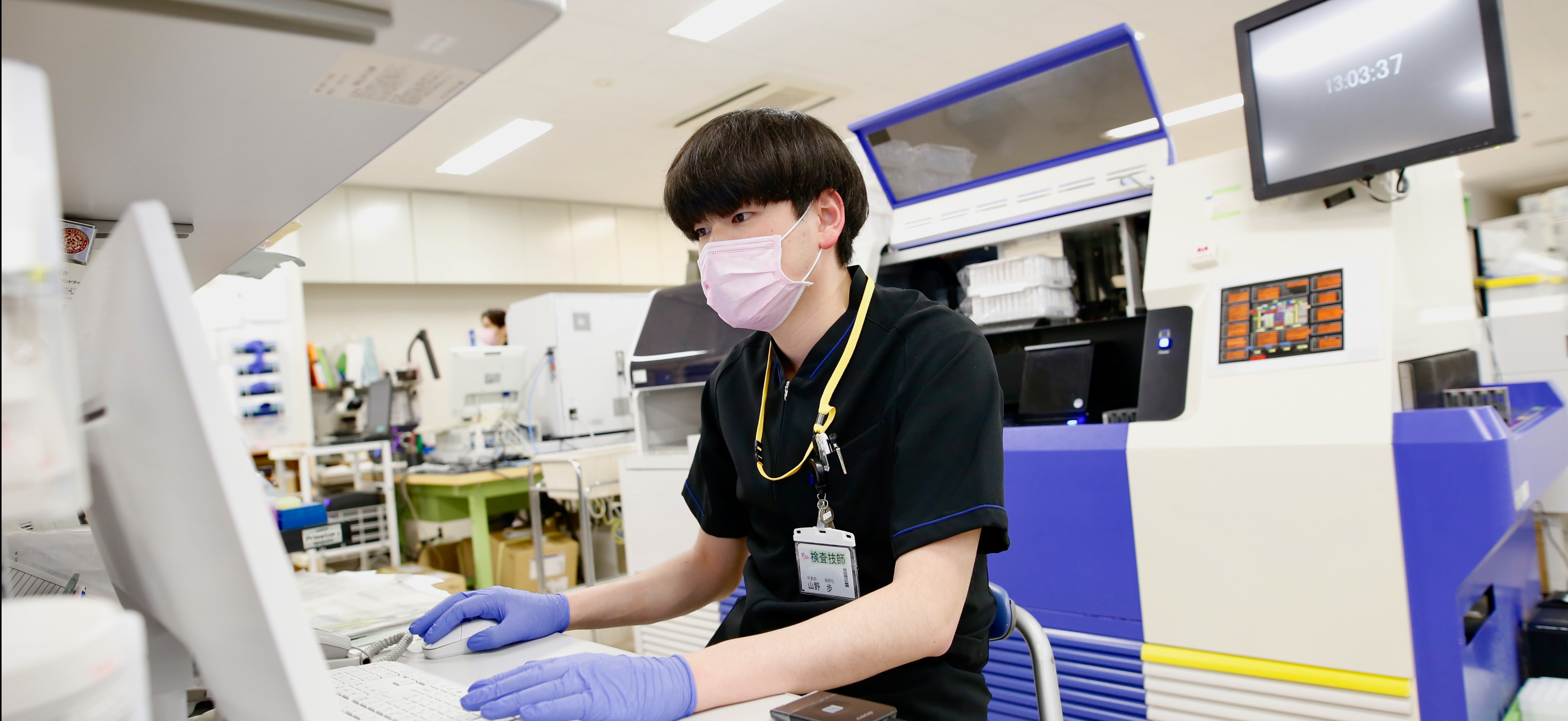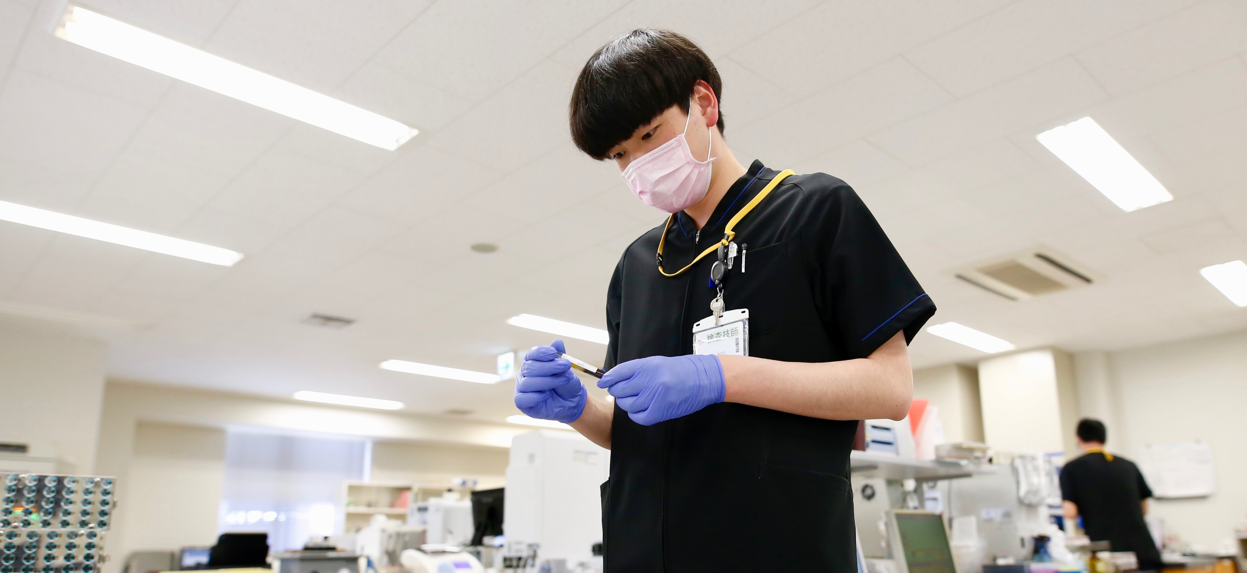 私は中央検査課で化学検査と免疫検査を担当しています。小倉記念病院は循環器診療に力を入れており心筋梗塞などを主として緊急性を要する患者さんがたくさん来られます。緊急性を要する患者さんの状態を見落とさないように検査値1つ1つに有用性があるのか分析機による誤差なのかをしっかり向き合って考える必要があります。有用性があると判断し担当医に検査値を報告、診療に役に立てた時にとてもやりがいを感じます。分析機による誤差によって検査値に影響を及ぼさないよう日々精度管理やメンテナンスをしっかり行い検査の正確性を高めています。