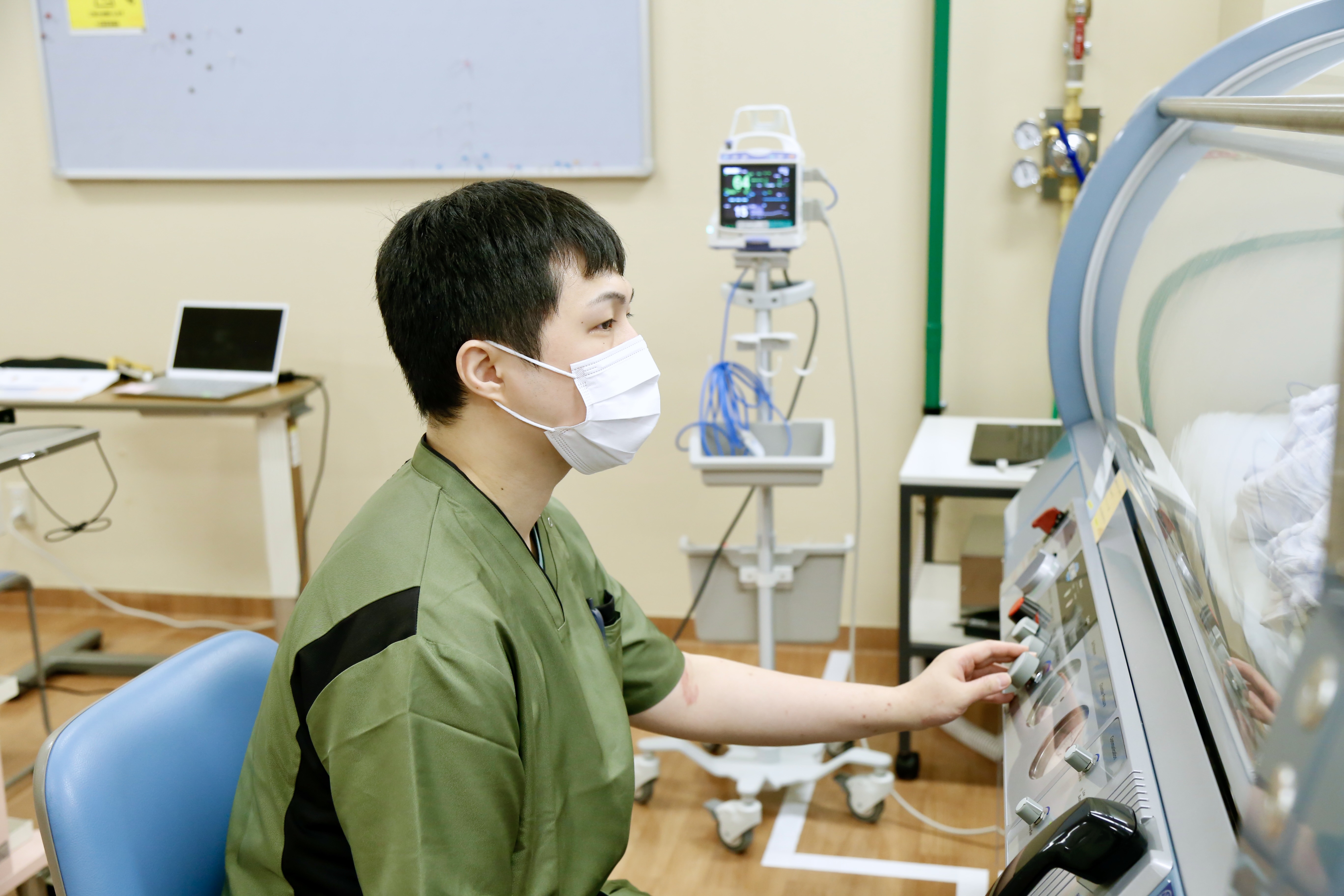 私は新卒で入職してから、手術室やME室、集中治療室などで、意識のない患者様を主な対象とした業務に携わってきました。これまでは、現場の環境を整えることや、職員同士で協力し患者様の治療に向き合うことにやりがいを感じてきました。4月からは高気圧酸素治療業務を担当し、患者様と直接会話しながら治療を進めることができるようになり、今までとは違ったやりがいを感じています。患者様の不安を少しでも和らげ、安心して治療に臨んでもらえるよう心がけています。小倉記念病院は、チームで支え合いながら前向きに働ける環境が整っており、私もその一員として成長し続けたいと思っています。