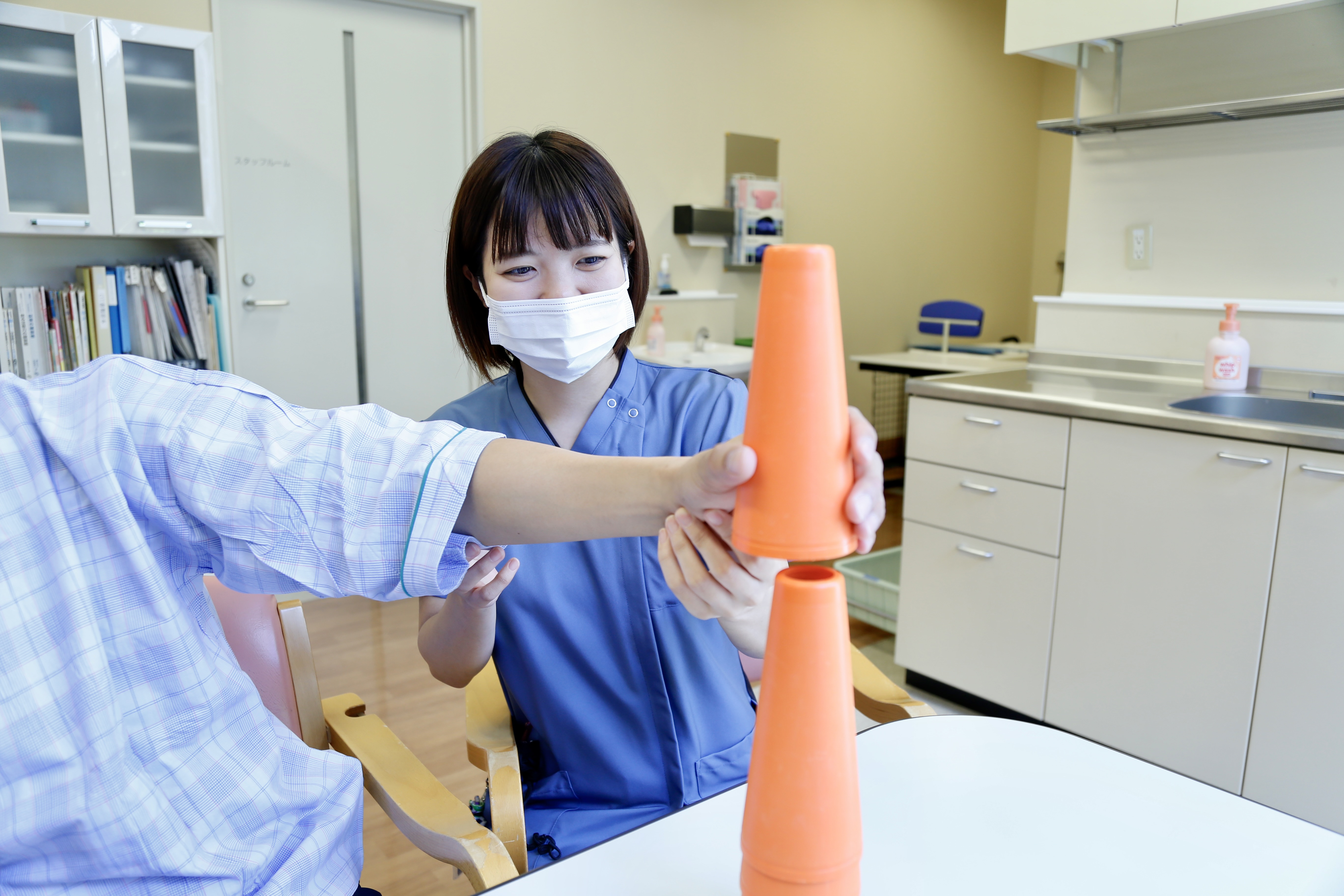私は現在、脳卒中チームで作業療法士をしております。当院のリハビリは、発症後間もない全身状態が不安定な方を対象とすることがほとんどで、患者さんの状態は、日に日に変わっていきます。状態が不安定な中での介入は難しさもありますが、「回復の最前線に立ち、回復の土台を作る」ことは、責任と意義のある仕事として、やりがいを感じています。また、脳卒中分野では、麻痺だけでなく、目に見えない高次脳機能などの後遺症により、当たり前にできていたことができなくなることも多いです。作業療法士として、患者さん一人一人の「その人らしさ」が再獲得できるよう、日々奮闘しています。