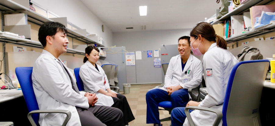 私が当院での研修を希望する決め手となったのは、当院の恵まれた環境でした。初期研修医は各科を数カ月単位でローテートしますが、それぞれの科で指導医や上級医が熱心に指導してくださり、積極性ややる気に応じて多くのことを学ぶことができます。また、初期研修医は同期が5人と比較的少人数であるため、1人あたりの担当患者は多く、幅広い症例の経験を積むことができます。主体的に症例と関わることで臨床能力は日々向上していき、診察や治療を経て自分自身の成長にやりがいを感じます。様々な医療スタッフと連携していくことで、実際に医療現場で活躍していることを実感することができ、診療をする上での自信へとつながります。