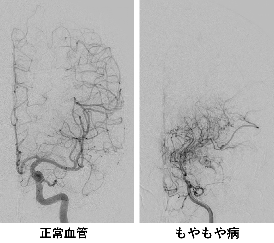 もやもや病とは脳の血管が通常の血管と異なり、文字通り「もやもや」とした血管に見えることから名づけられた病気です。内頚動脈という脳に栄養を送る太い血管の突き当り部分が細くなり、脳の血流が足りなくなることで症状が出現します。この血流不足を補うために太い血管から枝分かれした細い血管が拡張・新生することで通常みられないもやもや血管が出現します。この血管は脆く部位によっては出血しやすいことがわかっています。