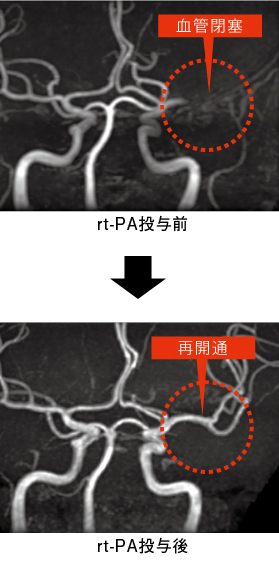 脳卒中になっても、後遺症を最小限にするために知っておいていただきたいことは、脳梗塞に対するrt-PA治療以外にも、脳卒中専門病院では血管内治療(血管の中からの治療)や外科手術によって脳卒中を良くすることができる可能性があります。いずれにしても、脳卒中になった時に、後遺症を最小限にするためには、できるだけ早く専門病院に到着することが大切です。「rt-PAガイドライン」では、患者さんが病院に搬送されてから1時間以内のrt-PA投与が推奨されていますが、当院では搬送されてから30分以内の治療開始を目標に掲げた【脳卒中スクランブル体制】を整えています。