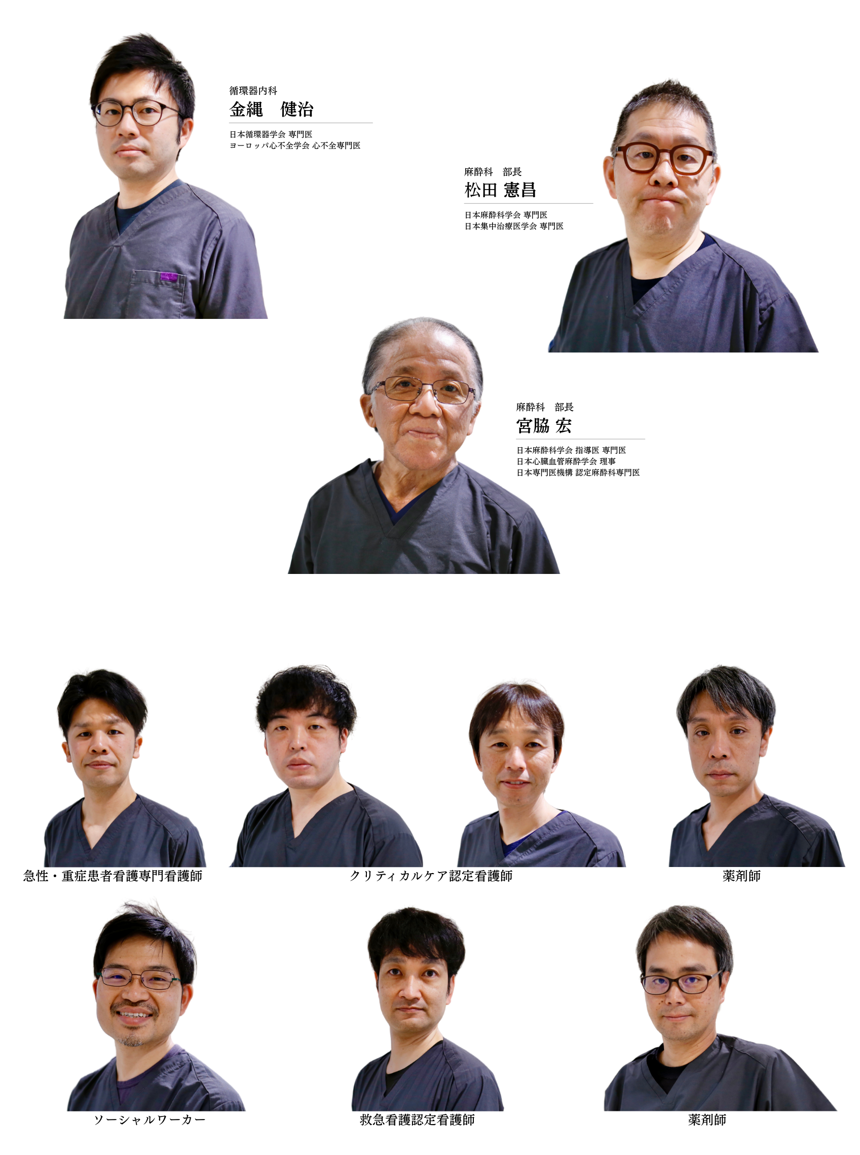 当院のRRTは、全身監理の経験が豊富な集中治療医を中心とした医師の他、救急・集中治療領域で活動する専門看護師・認定看護師を中心とした看護師、または集中治療室での活動経験を持つ薬剤師など多職種の専門家によって構成されています。RRTでは、一般病棟で治療を受けている重症患者、および重症化のリスクが高い患者に対して迅速に対応します。その結果、重症の更なる重篤化を回避すること、そして重篤化によって起こる急変を未然に防ぐことを目指し、日々活動しています。